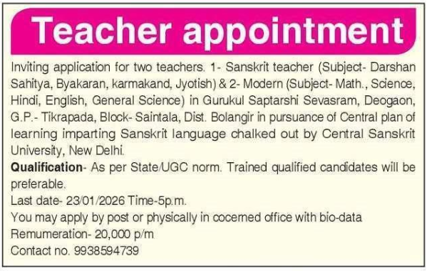 Vacancies details for Teacher Recruitment at Balangir Gurukul Saptarshi Sevasram