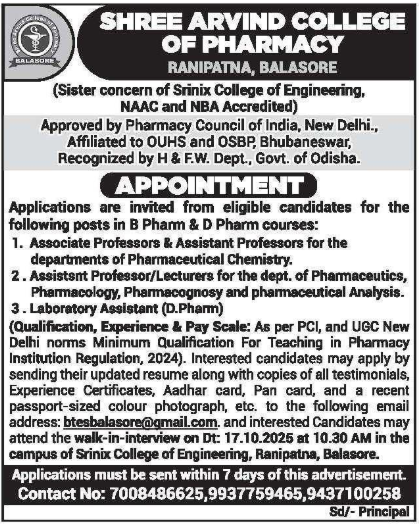 Teaching Jobs in Balasore 2025: Vacancy at Shree Arvind College of Pharmacy