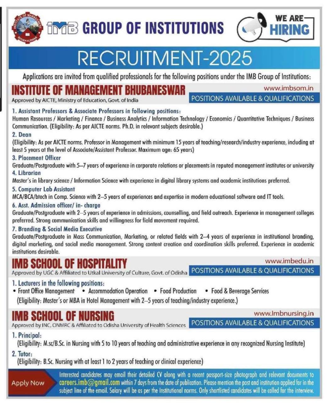 Teaching Jobs in Bhubaneswar Odisha: Recruitment at IMB Group of Institutions Bhubaneswar