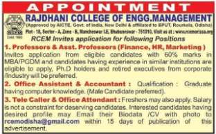 Teaching Jobs in Bhubaneswar Odisha: Recruitment at RAJDHANI COLLEGE OF ENGG. MANAGEMENT Bhubaneswar