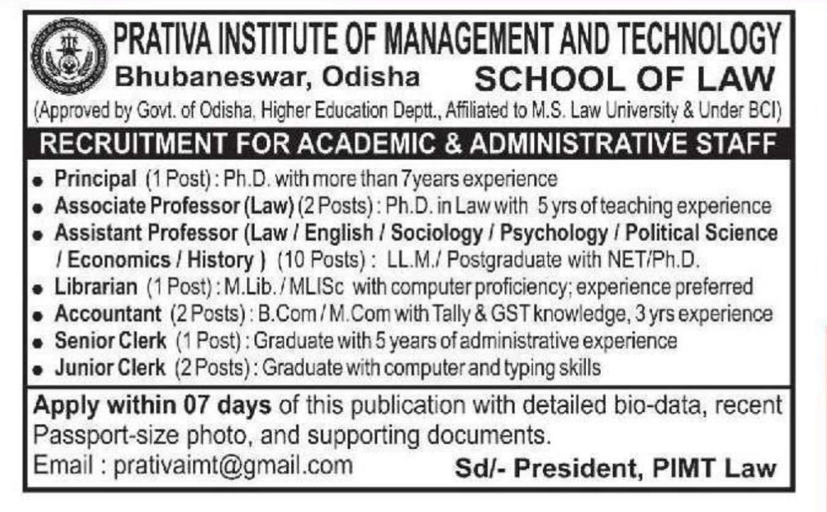 Teaching Jobs in Bhubaneswar Odisha: Recruitment at PRATIVA INSTITUTE OF MANAGEMENT AND TECHNOLOGY – SCHOOL OF LAW Bhubaneswar, Odisha