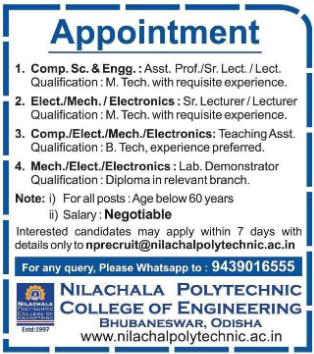 Nilachala Polytechnic College of Engineering, established in 1997 in Bhubaneswar, Odisha, is currently seeking qualified and experienced professionals to fill several teaching and technical positions.