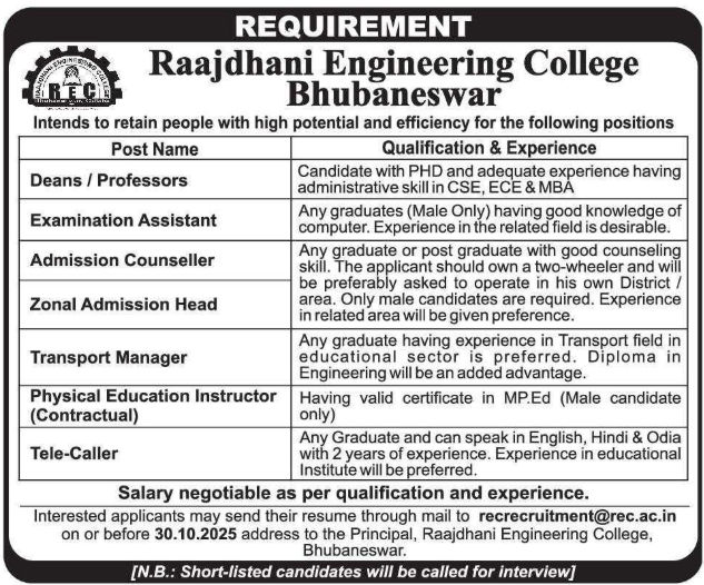 Interested applicants may send their resume through mail to recruitment@rec.ac.in on or before 30.10.2025 address to the Principal, Raajdhani Engineering College, Bhubaneswar.