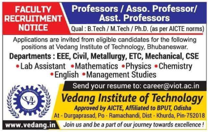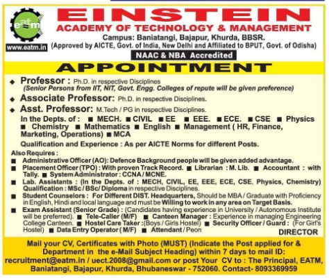Teaching Jobs in Bhubaneswar Odisha: Recruitment at Einstein Academy of Technology & Management (EATM), Bhubaneswar