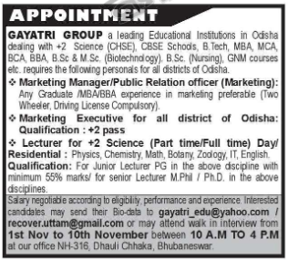 - Lecture in Physics, Chemistry, Math, Botany, Commerce, Hindi and Odia (Master Degree with minimum 2 years Exp.)