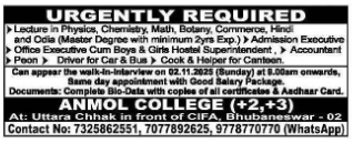ANMOL COLLEGE, BHUBANESWAR is hiring Lecture in Physics, Chemistry, Math, Botany, Zoology, IT, Commerce, English, Hindi and Odia (Master Degree with minimum 5yrs Exp). Admission Executive Office Executive (Female) Accountant Boys & Girts Hostel Superintendent Peon Driver for Car & Bus Cook & Helper for Canteen. Can appear the walk-in-Interview on 24.08.2025 (Sunday) at 9.00am onwards, Same day appointment. Documents: Complete Bio-Data with copies of all certificates & Aadhaar Card.