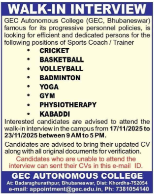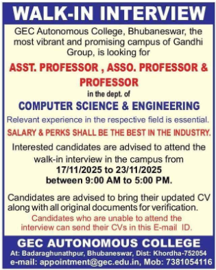 Walk-in Interviews at GEC Autonomous College, Bhubaneswar:
