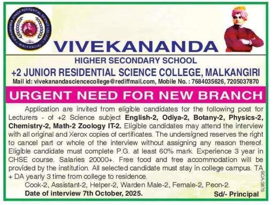 Teaching Jobs in Malkangiri 2025: Vacancy at Vivekananda HSS