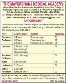The Mayurbhanj Medical Academy and Mayurbhanj School and College of Nursing are recognized by the Govt. of Odisha (H & FW DEPT) & approved by PCL, New Delhi and the INDIAN NURSING COUNCIL, NEW DELHI is inviting applications from eligible candidates with the requisite qualifications and experience for the following positions to be filled for the academic year 2025-2026.