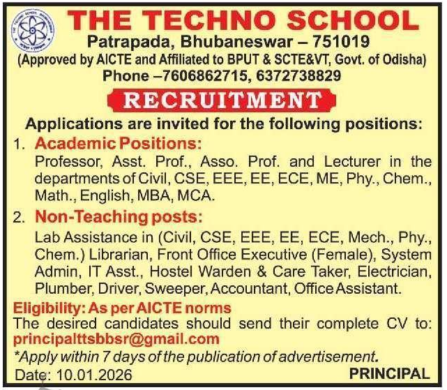 The Techno School Bhubaneswar Recruitment 2026: The Techno School, located in Patrapada, Bhubaneswar, has announced multiple openings for academic and non-teaching positions. The institution is approved by AICTE and affiliated with BPUT & SCTE&VT, Govt. of Odisha.