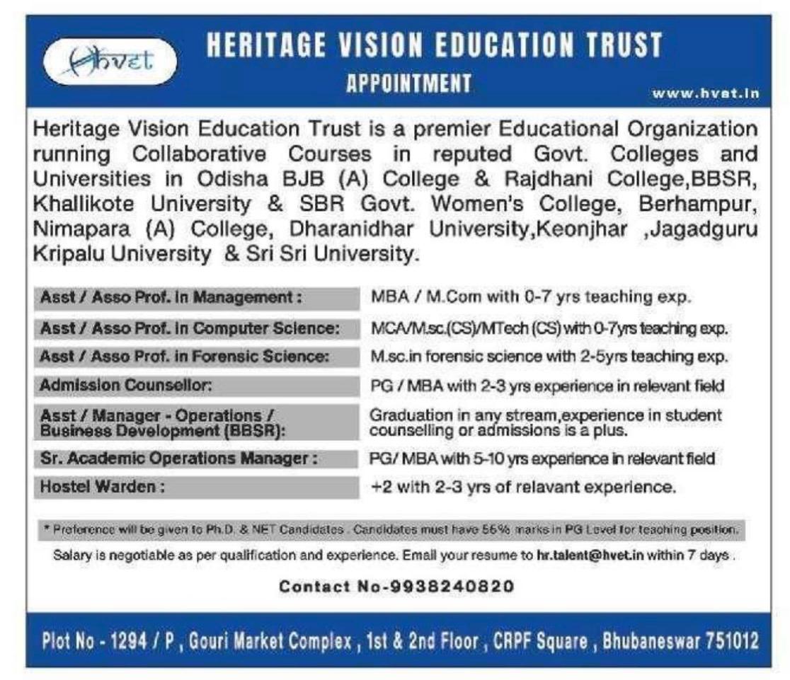 Vacancy at Heritage Vision Education Trust 2026: Heritage Vision Education Trust, a premier organization collaborating with top government colleges and universities—including BJB (A) College, Rajdhani College, Khallikote University, and Sri Sri University—is now hiring for multiple academic and administrative roles.