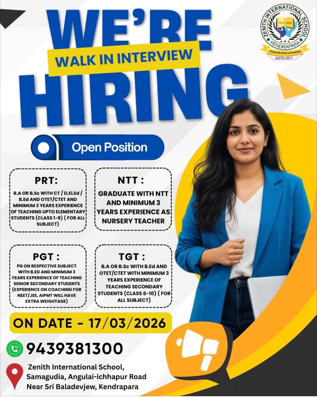 Walk-in Interview at Zenith International School, Kendrapara